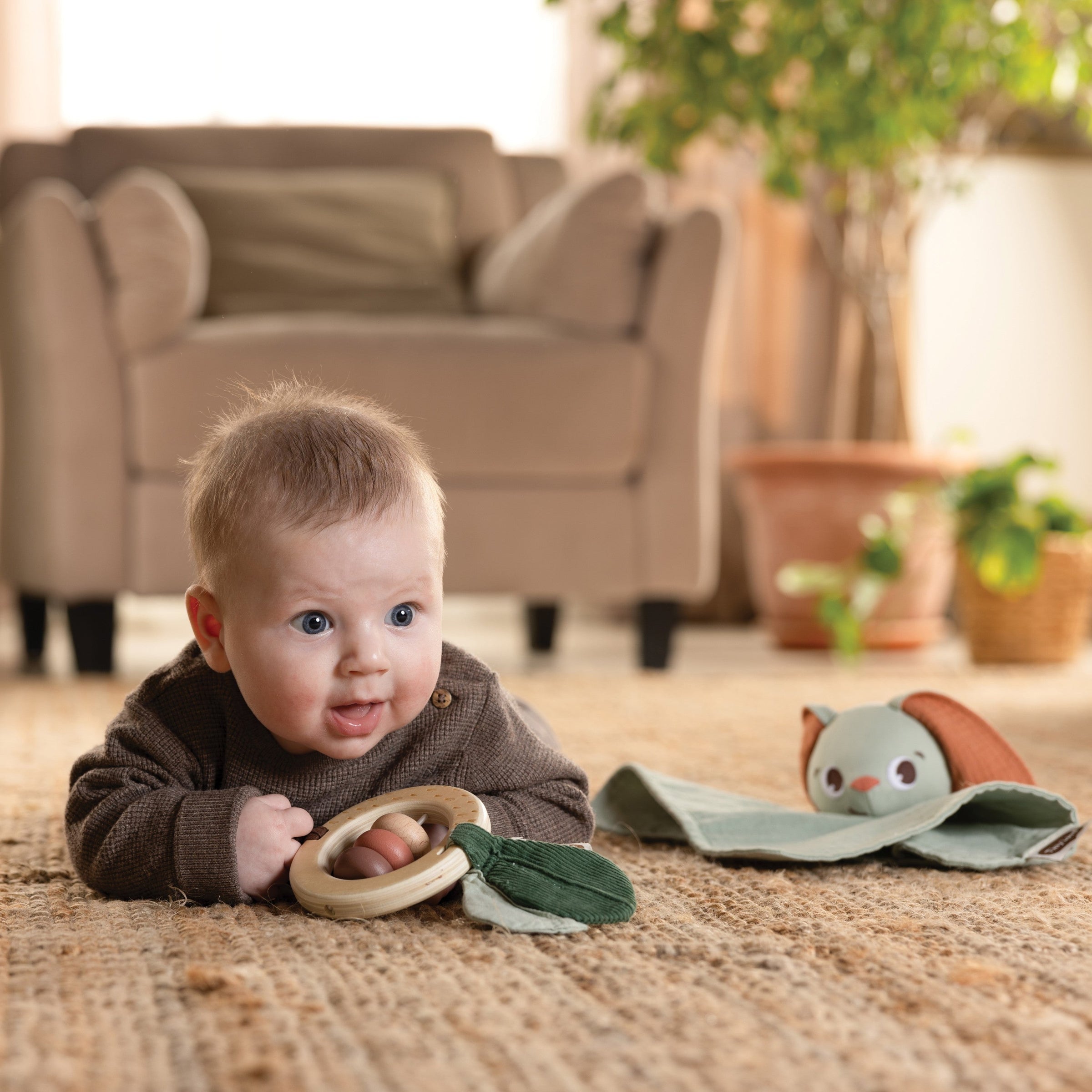 Our delightful Gift Set is ideal for comforting little ones and nurturing their curiosity. Designed to offer babies comfort and stimulation, this adorable newborn gift set includes a super-soft bunny lovey, which supports baby’s emotional and sensory growth, and a charming wooden rattle to foster motor skills and sensory and cognitive development.